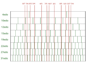 The first edo consistent to the 7-odd-limit is 4edo, which maps 5/4 to 1 step, 3/2 to 2 steps, and 7/4 to 3 steps, laying down a rough framework of tetradic harmony. Then, 10edo approximates the 7-odd-limit relatively accurately for size, though it conflates several interval pairs: 5/4~6/5, 7/6~8/7, and 7/5~10/7. As such, the 10-form is useful for classifying the 7-limit. After that, 12edo distinguishes 5/4 from 6/5 and 7/6 from 8/7, though it has 6/5~7/6 and 7/5~10/7, and the 7th harmonic is tuned very sharply. The 15edo and 19edo tunings distinguish 5/4, 6/5, and 7/6, as well as 7/5 and 10/7, but 7/6 is equated to 8/7, an equivalence known as Interseptimal or Semaphore temperament. The first to distinguish all of 5/4, 6/5, 7/6, and 8/7 is 22edo, though 7/5 is still equated with 10/7. The first edo to distinguish the entire 7-odd-limit is 27edo, but one may prefer 31edo for a more accurate approximation.